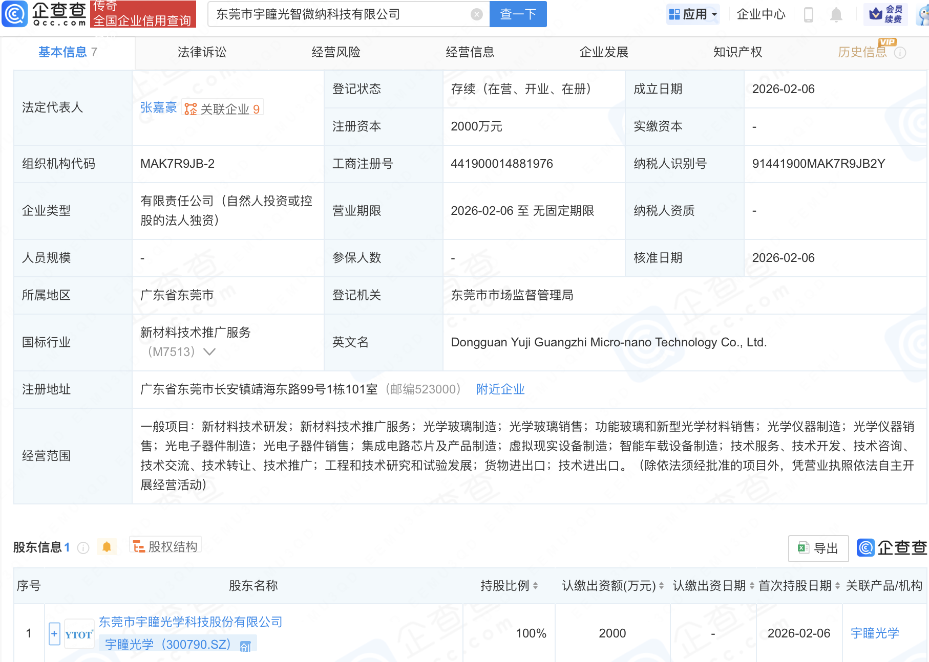 近日,东莞市宇瞳光智微纳科技有限公司成立,注册资本2000万元,经营范围包含:集成电路芯片及产品制造;虚拟现实设备制造;智能车载设备制造等。企查查股权穿透显示,该公司由宇瞳光学(300790)全资持股。